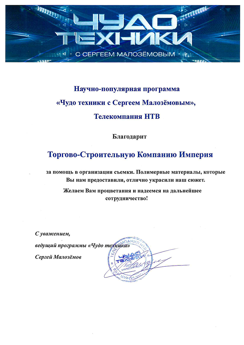 ТСК Империя помогла программе "Чудо техники с Сергеем Малозёмовым" предоставив полимерные материалы для экспериментов во время съемки. Продюсер, ведущий программы и съемочная группа были очень признательны написав благодарственное письмо.