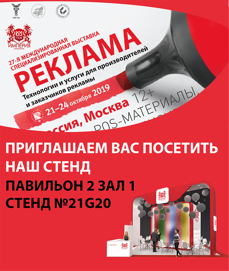 Приглашаем Вас посетить крупнейшую выставку для рекламной индустрии "Реклама-2019". Выставка пройдет в ЦВК «ЭКСПОЦЕНТР» Москва, Краснопресненская наб., 14, 21-24 октября 2019.