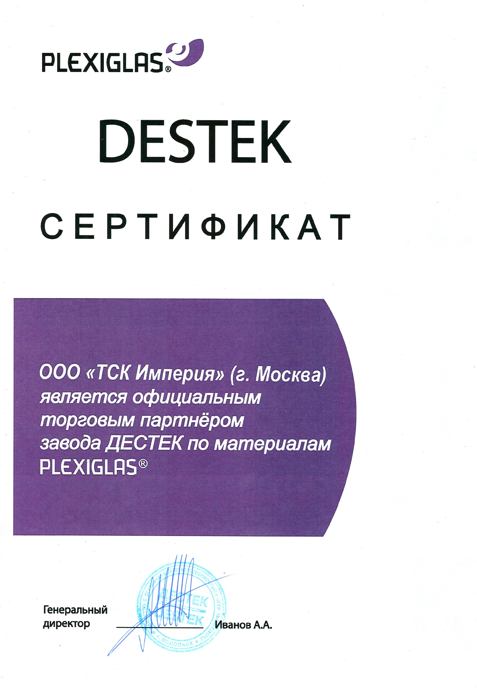 - Сертификат официального торгового партнера завода ДЕСТЕК по материалам PLEXIGLAS.