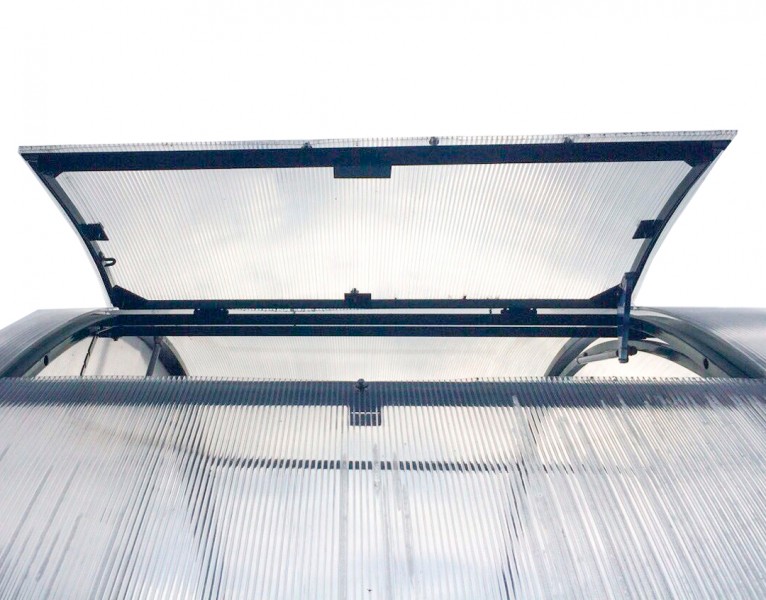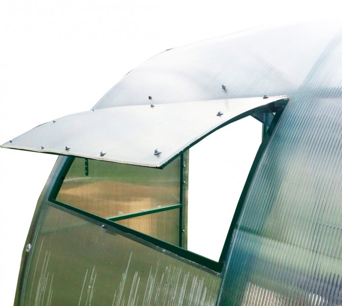 По Вашему желанию вы можете укомплектовать теплицу боковымифорточками с автоматическим открыванием. Форточка может бытьврезана в любом удобном месте, а автоматика открывания срабатывает в зависимости от температуры в теплице. Размер форточки 0,93*0,5м.