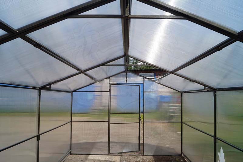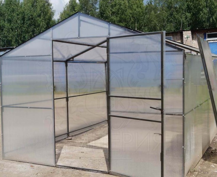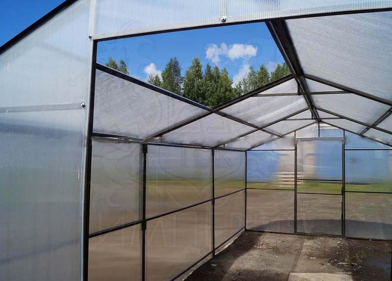Каркас из стальной профильной трубы с антикоррозийной окраской. Теплица оснащена вставками в крышу, что позволяет проветривать. Вставки снимаются полностью на зимний период, что позволяет избежать снеговой нагрузки.