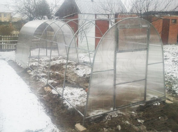 Теплица в покрытом состоянии рассчитана на снеговую нагрузку не более 80 кг/м2.