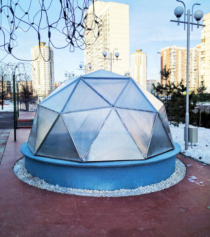 Компания ООО "Торгово-Строительная Компания Империя" осуществила расчет, комплектацию и поставку сотового поликарбоната для навеса(купола) над фонтаном на зимний период.