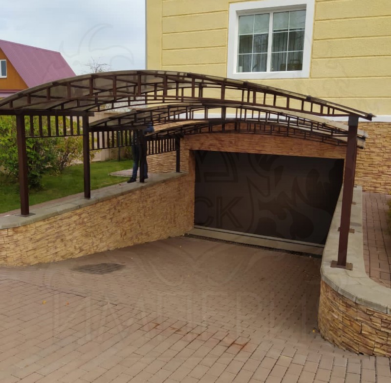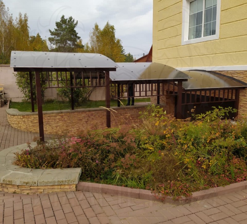 Компания "ТСК Империя" осуществила расчет, комплектацию и поставку материала для навеса. Навес выполнен из сотового поликарбоната Lexan толщиной 10 мм; цвет бронза. Объект выполнен 2020 году.