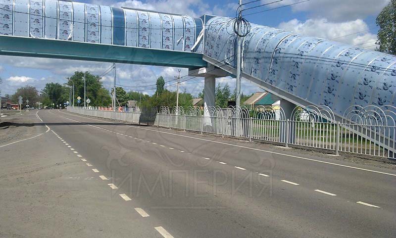 Компания ООО "ТСК Империя" осуществила расчет и поставку монолитного поликарбоната для остекления пешеходного перехода в Орловка обл. п. Беседино. Надземный пешеходный переход выполнялся из литого поликарбоната толщиной 5 мм, цвет: голубой.