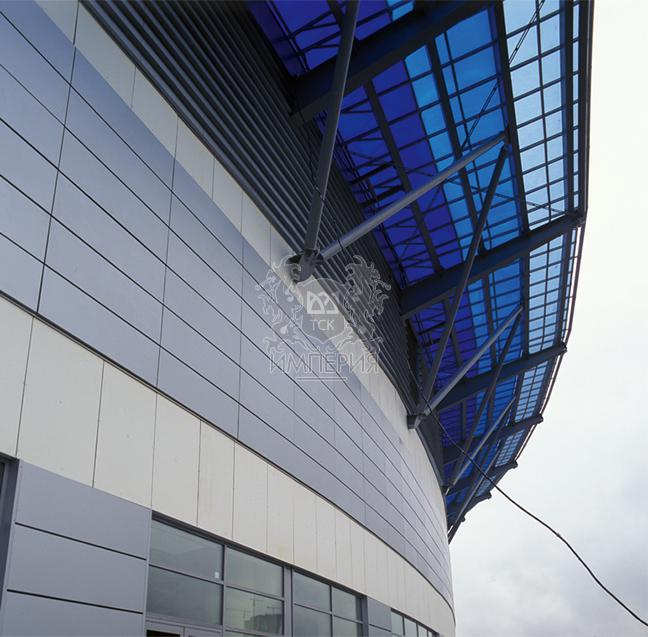 Специалисты работающие в настоящий момент в нашей компании принимали участие в работе над остеклением Ледового Дворца в Крылатском в части поставок и комплектации козырька из моноилтного поликарбоната STRONEX толщиной 10мм в трех оттенках синего цвета (Синий1, Синий2, синий3 - от светлого к темному). Наша компания не осуществляла монтаж на данном объекте.