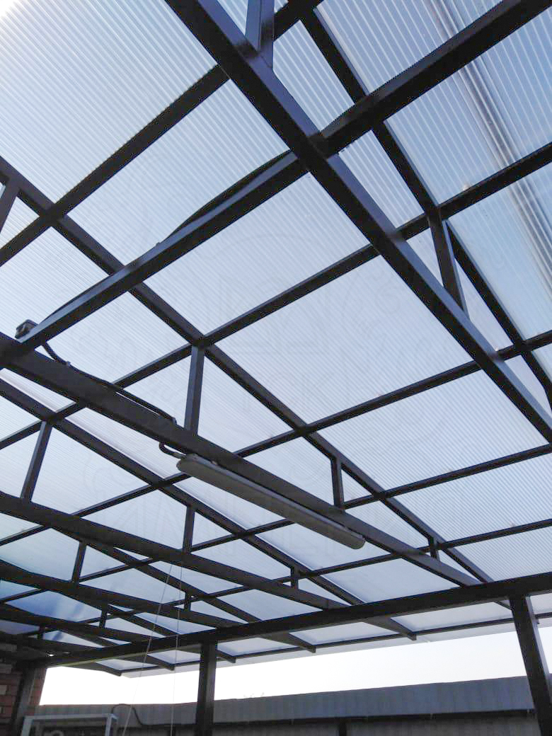 В объекте использован сотовый поликарбонат Lexan толщиной 16 мм с уникальной структурой 9Х, а также комплектующие профили, термошайбы, специальная перфорированная лента IRROX.