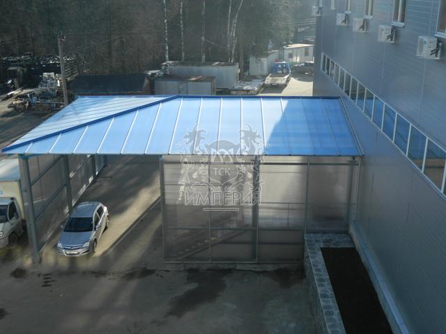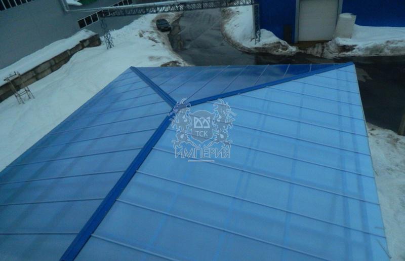 На кровле использовалась замковая система Sunpal из сотового поликарбоната толщиной 20мм голубого цвета.