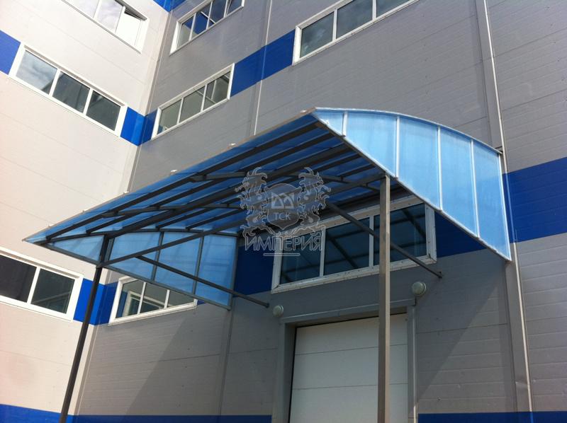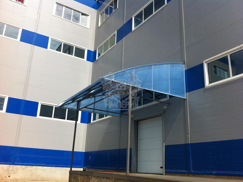 Компания "ТСК Империя" осуществила расчет, комплектацию и поставку замковых панелей. Навес выполнен из кровельной системы структурированного поликарбоната SUNPAL с интегрированным замком толщиной 20мм голубого цвета. Объект выполнен 2012году.