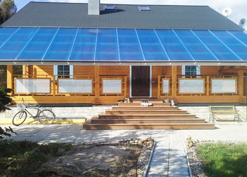 На кровле использовалась замковая система Sunpal из сотового поликарбоната с гарантией от протечек 25 лет  толщиной 20 мм синего цвета.