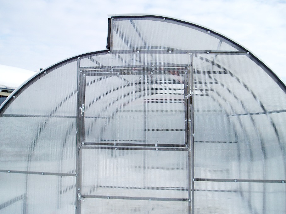 Каркас из стальной профильной трубы с антикоррозийной окраской. Теплица оснащена вставками в крышу, что позволяет проветрить, а в зимний период позволяет избежать снеговой нагрузки.