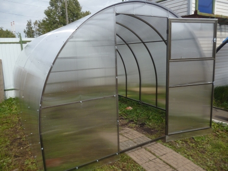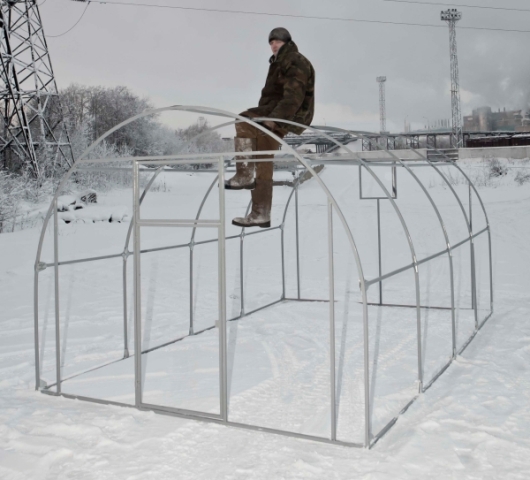 Каркас теплицы изготовлен из металлического оцинкованного профиля сечением 20х20 мм. Продольные перемычки находятся на одном уровне с внешней стороной дуги, что обеспечивает большую площадь опоры поликарбоната и соответственно меньшую нагрузку на него в зимний период.