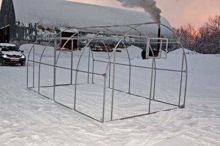 Теплица обладает более мощным каркасом и имеет нестандартную форму. Благодаря увеличенному углу наклона крыши, она способна выдерживать значительные снеговые нагрузки.