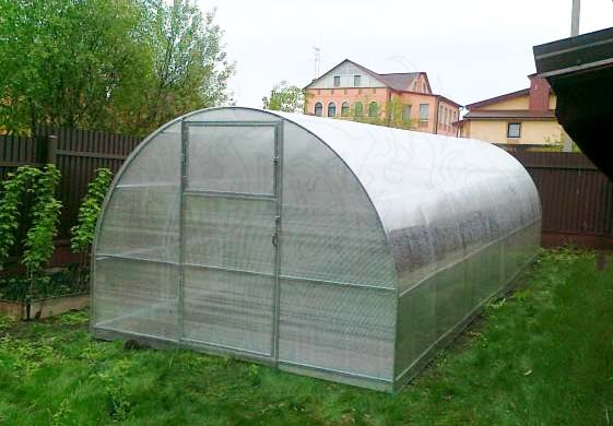 Низкая стоимость, удобство транспортировки (малые габариты при перевозке), хорошо отработанная технология производства. Теплица имеет два дверных проёма в противоположных торцах и в каждом дверном проеме имеет дверь и форточку. Покрытие на зиму нужно снимать. Каркас теплицы изготовлен из оцинкованного профилированного железа толщиной 0,8мм.