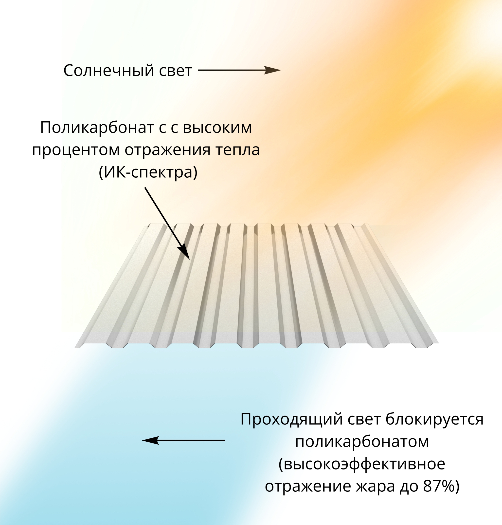Панели и листы IR-REFLECTION - уникальный продукт, разработанный с применением технологии многослойных покрытий. Многослойная энергоэффективная структура IR-REFLECTION предназначена для создания комфорта в помещениях в странах с жарким климатом, она обеспечивает значительное сохранение освещенности в сочетании с высоким процентом отражения тепла (ИК-спектра), предотвращая излишний нагрев. По истине уникальное решение, позволяющее селективно использовать солнечное излучение и снизить потребление электроэнергии.