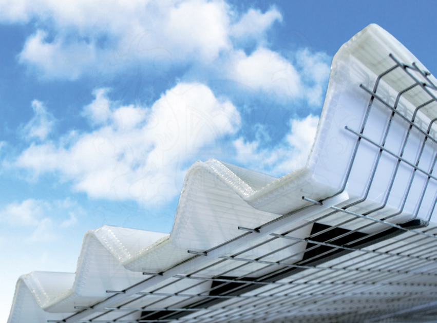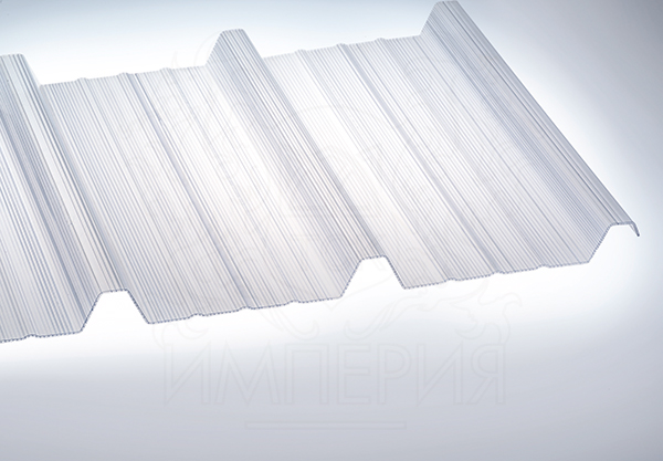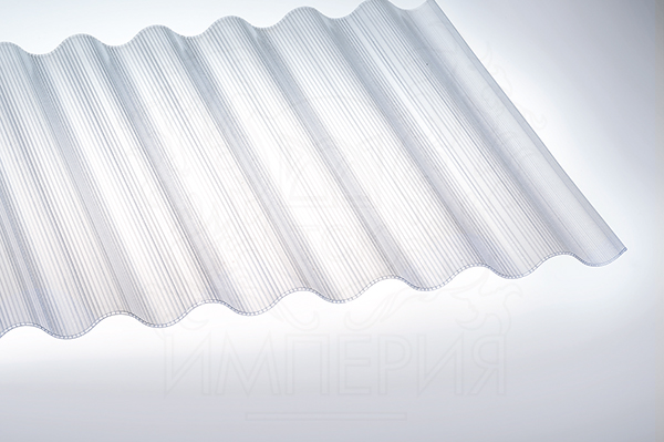 Гофрированные листы сотового поликарбоната различных толщин и формы. Ячеистая структура листов дает высокие теплоизоляционные свойства, а сложная форма сечения позволяет значительно уменьшить шаг опорной металлоконструкции. Листы имеют УФ защиту и могут быть использованы в сочетании с композитными панелями или металлическими профилированными листами.
