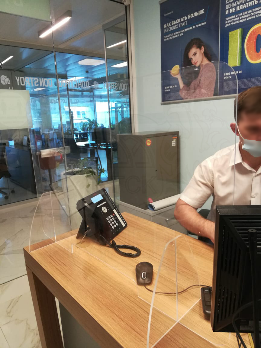 Экран-завеса защищает от прямого контакта с посетителем. Имеет низкий вес, конструкция экрана позволяет легко установить его на стол или перенести на новое место.